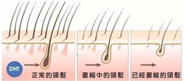 其次則是雄性荷爾蒙的影響,其中以DHT為主要元兇,因為DHT會進入毛囊細胞核中,對於代謝系統產生強力的抑制作用,使毛囊無法進行蛋白的合成,成為休止期毛髮,大約3 個月內就會脫髮萎縮。