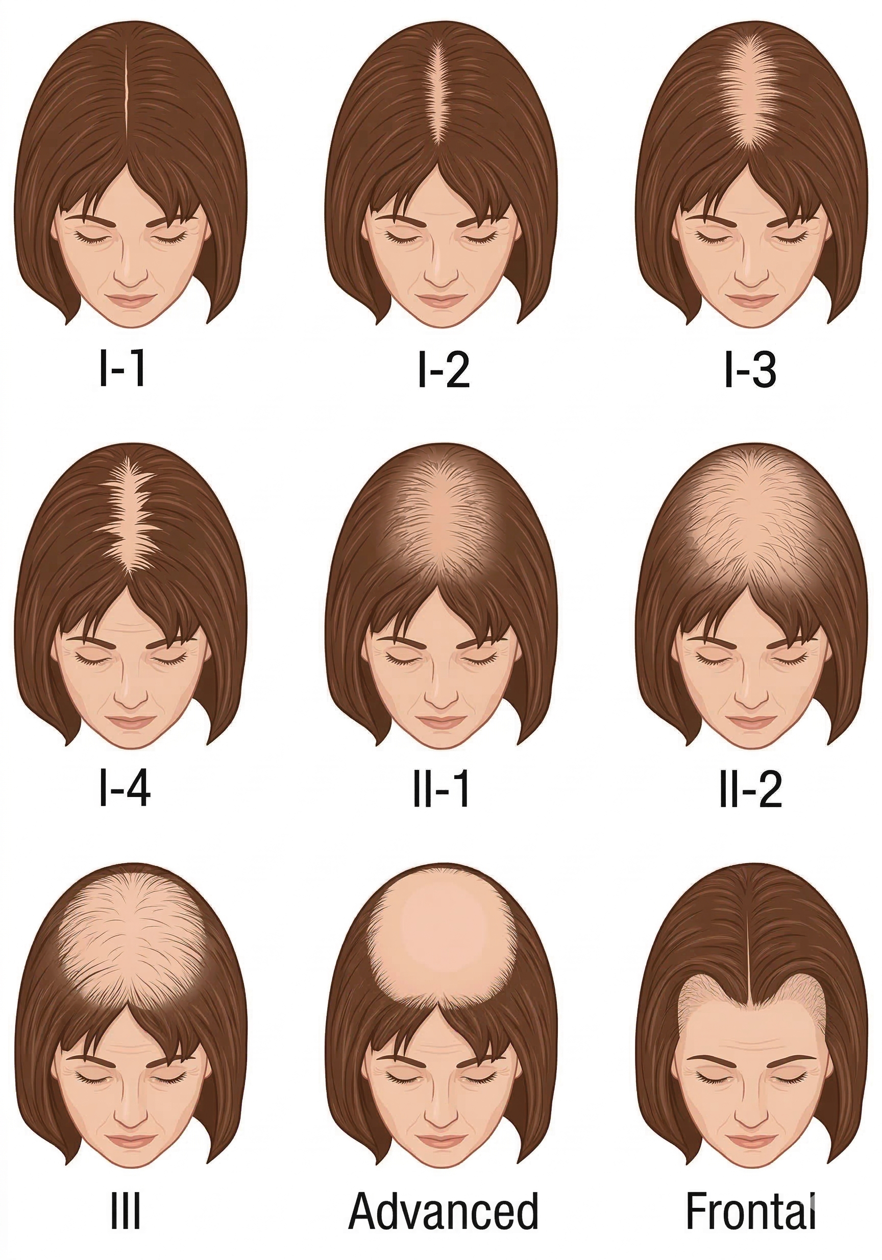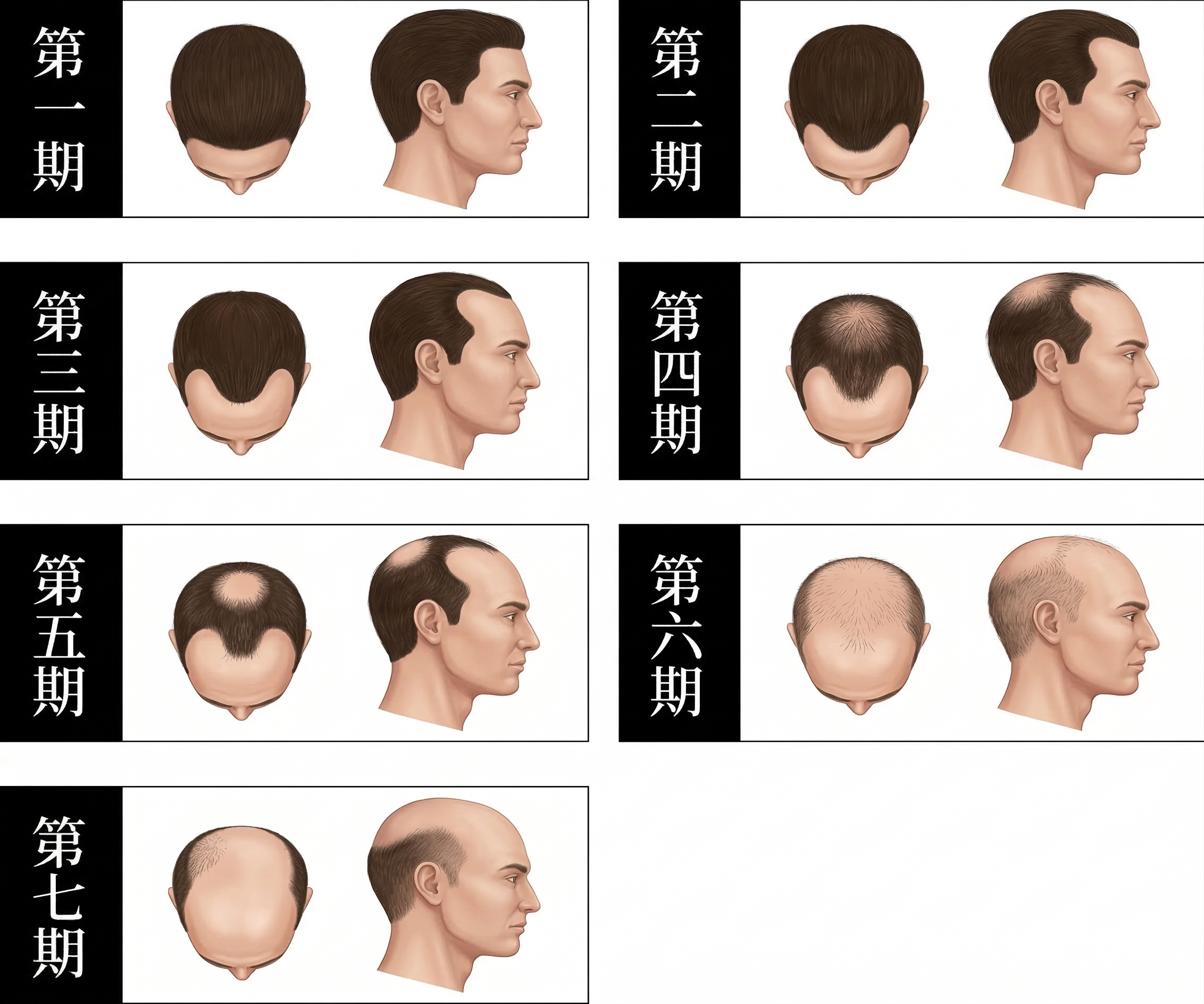 目前統計起來,亞洲有20%左右的成年男性有雄性禿的困擾,女性也有6%左右的人口有這方面的問題,只是相較起來,男性的雄性禿通常會進展得比較快、比較嚴重,一旦發生,大家就會想知道自己現在的嚴重程度,希望尋求適合的治療方式。臨床上醫師會將男女性雄性禿用以下圖表分為不同期的方式來評估嚴重程度。