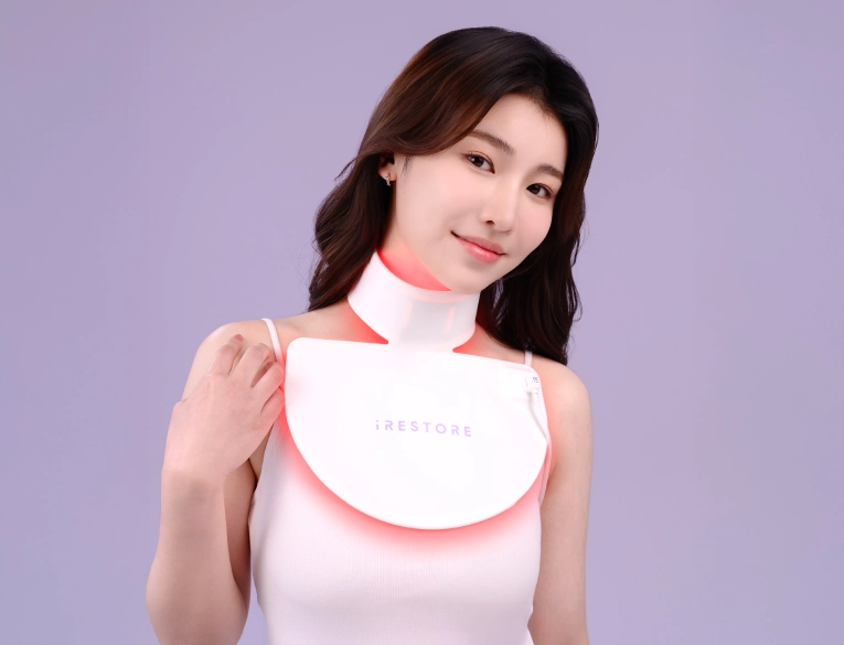 ●頸胸美膚儀: 頸部保養常被忽略,卻是最會出賣年齡的地方!隨著時光流逝,頸部肌膚易出現肌膚紋理與色澤不均的現象。iRESTORE全新推出的頸胸美膚儀,使用經實驗證實有效的光波,能溫和調理,提升肌膚質感,讓頸部更加柔滑細緻,展現自然光澤與勻亮質感。
