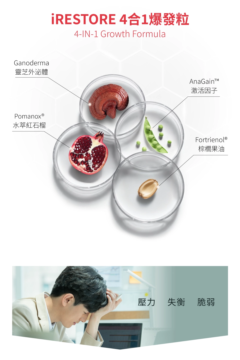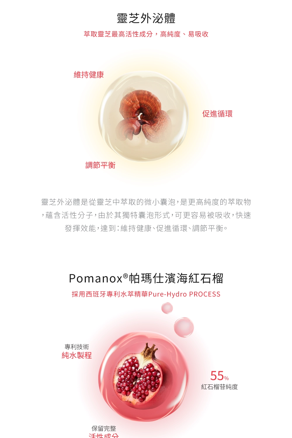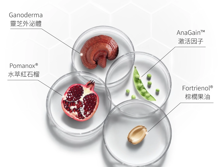 市售成分最完整的強韌根基補給品,由靈芝外泌體領銜,結合兩大專利成分「西班牙Pomanox®紅石榴」與「瑞士植萃激活因子AnaGain™」,搭配市售唯一的棕櫚果油,找回健康、自信的良好狀態。