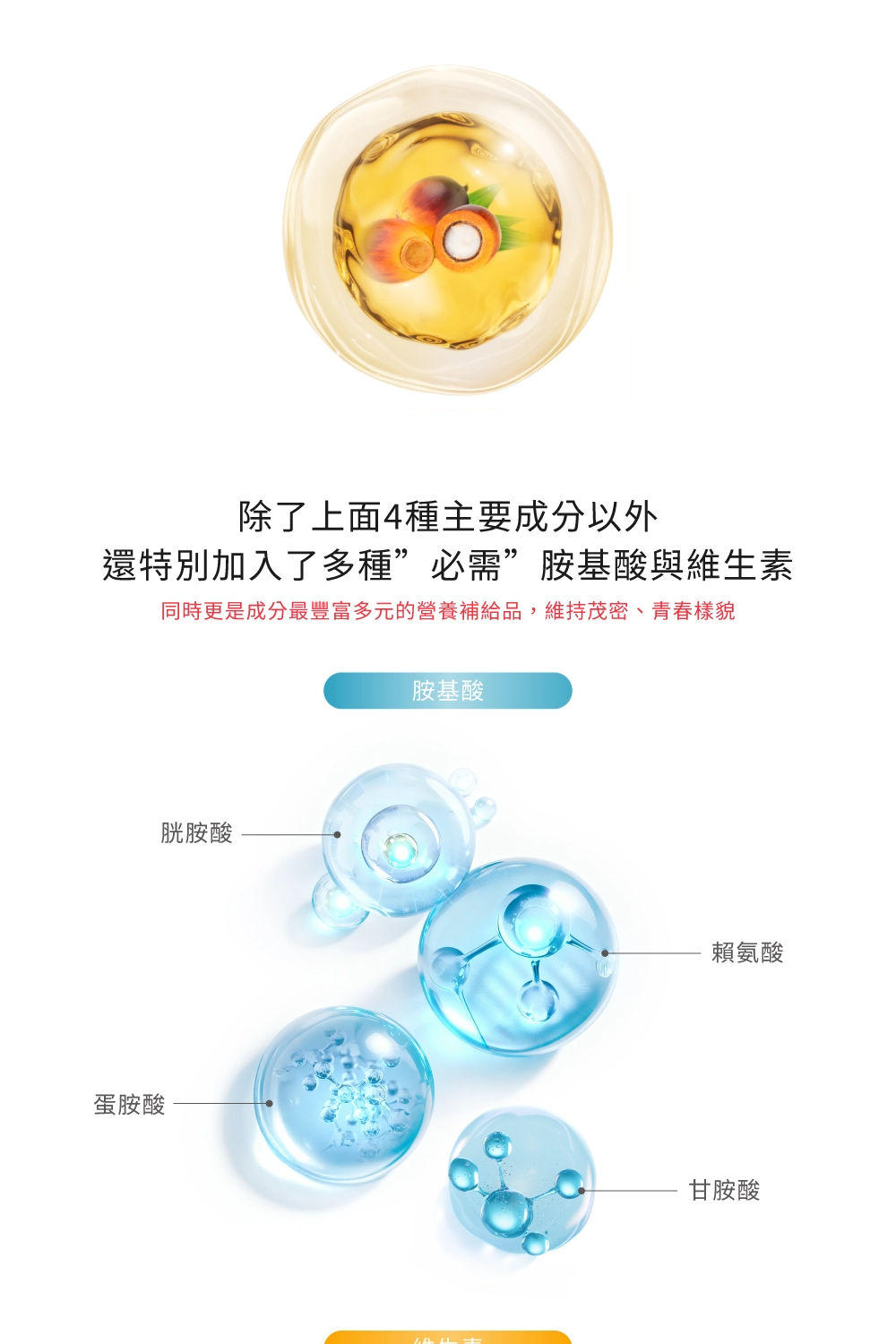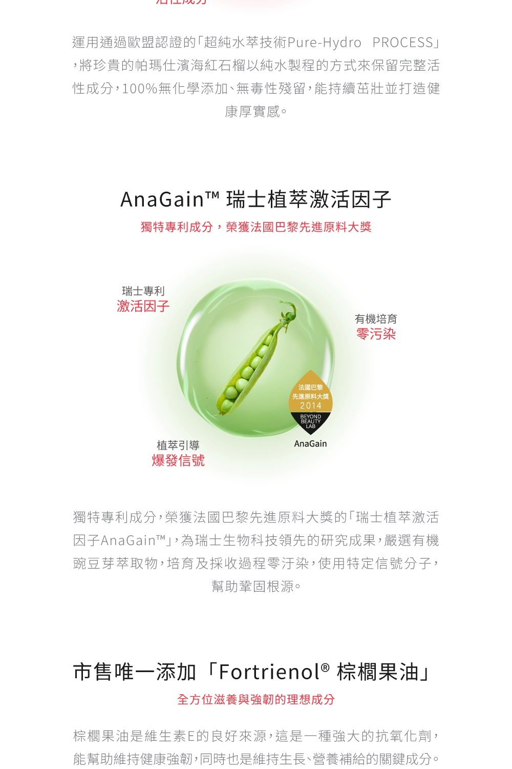 | 成分 | 靈芝萃取物,西班牙紅石榴萃取物,瑞士有機碗豆萃取物,棕櫚果油萃取物,L-半胱胺酸,L-賴氨酸,L-蛋胺酸,維生素A,維生素C,維生素D,酵母硒,甘胺酸鋅。 |