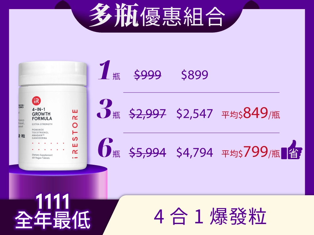 | 數量組合優惠 | 1瓶 (現省$100), 3瓶 (現省$450,每瓶$849), 6瓶 (現省$1,200,每瓶$799) |