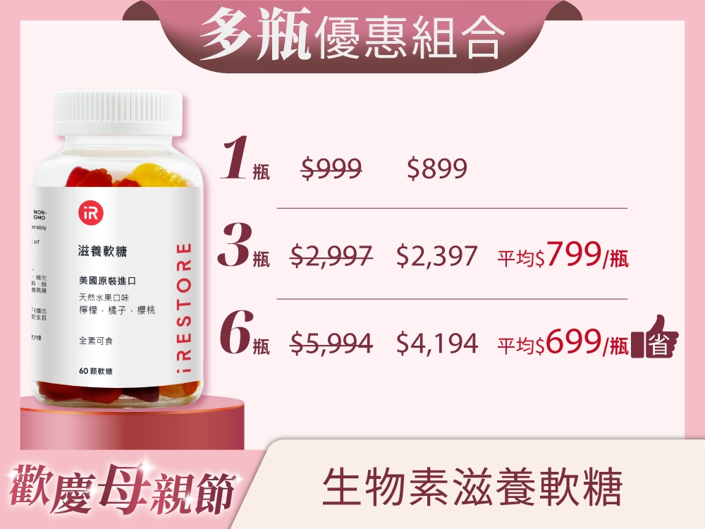 | 數量組合優惠 | 【升級版】1瓶 (現省$100), 【升級版】3瓶 (現省$600,每瓶$799), 【升級版】6瓶 (現省$1,800,每瓶$699) |