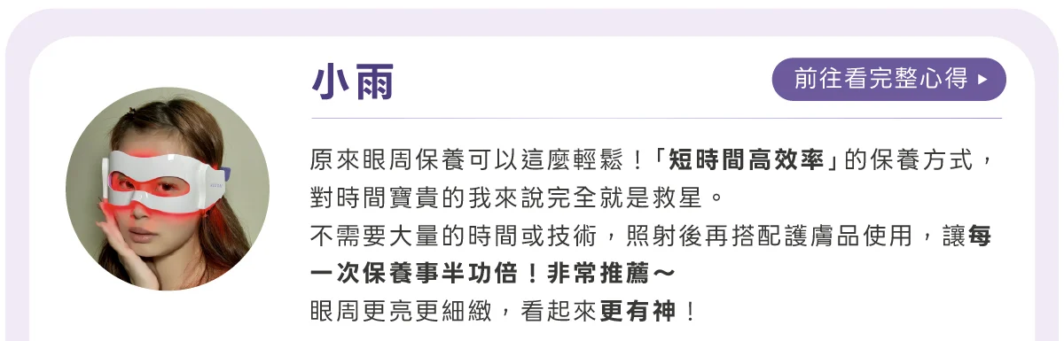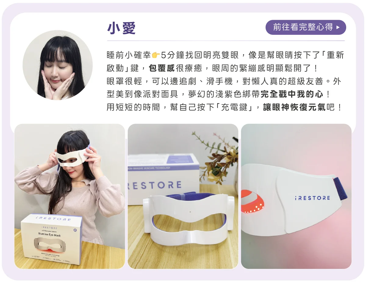它能保養眼周肌膚,讓眼周更透亮平滑,戴上去有點溫熱感,很像在做眼部SPA,用完後覺得眼周沒有這麼浮腫,肌膚也沒這麼緊繃了,眼睛整個看起來瞬間變得很有神!