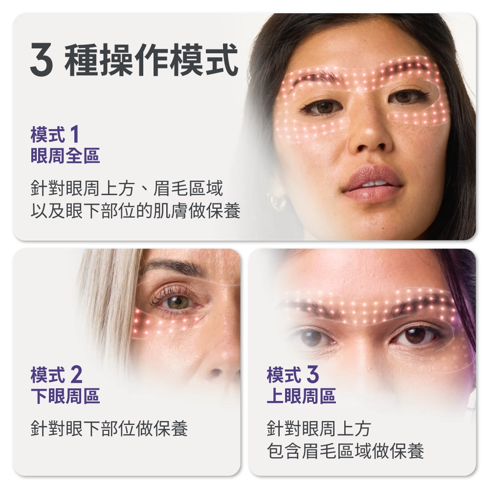 專為忙碌生活打造的眼周保養新日常!搭載180顆高密度LED光源,結合 633nm紅光與830nm紅外光雙波長科技,針對細紋、暗沉、疲態與鬆弛眼周精準呵護,輕盈貼合、免手持設計,在家也能輕鬆完成眼周護膚保養。