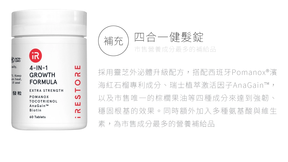 結合洗髮精、養髮液以及補充錠,四步驟打造頭皮健康環境的關鍵:【先清潔】採用天然植萃健髮洗髮精將頭皮髒污洗淨。【再滋養】使用獨特專利成分的激活因子養髮液來達到增加強韌,活絡豐盈的效果。【後補充】富含多種營養成分及靈芝外泌體的四合一爆發粒補足每日所需養分。【戴上生髮帽】利用低能量雷射照光,賦予頭皮健康良好的環境。