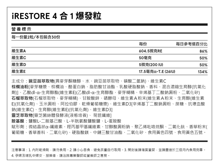 | 成分 | 靈芝萃取物,西班牙紅石榴萃取物,瑞士有機碗豆萃取物,棕櫚果油萃取物,L-半胱胺酸,L-賴氨酸,L-蛋胺酸,維生素A,維生素C,維生素D,酵母硒,甘胺酸鋅。 |
