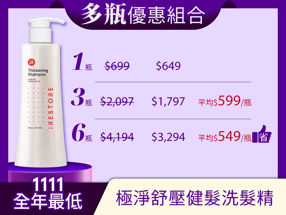 | 數量組合優惠 | 1瓶 (現省$50), 3瓶 (現省$300,每瓶$599), 6瓶 (現省$900,每瓶$549) |